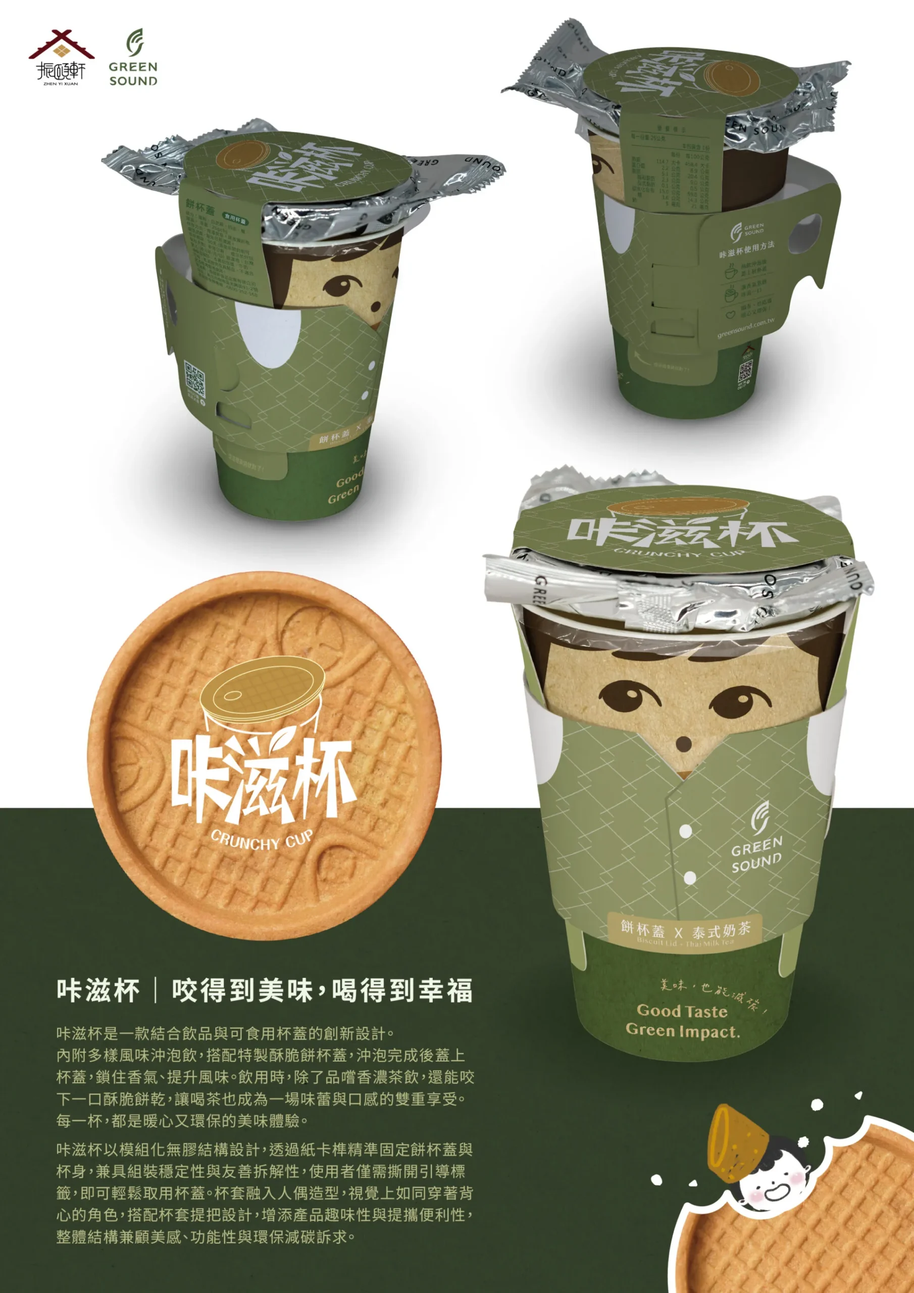 設計理念:咔滋杯是一款結合飲品與可食用杯蓋的創新設計。