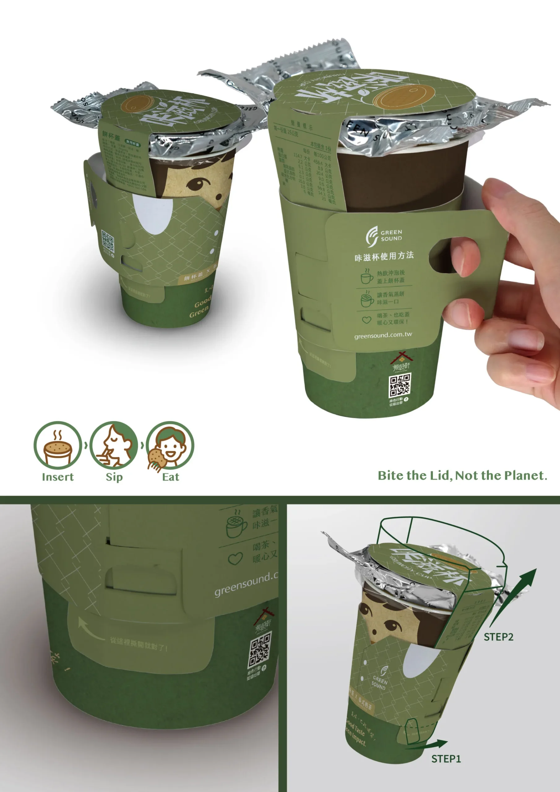 咔滋杯以模組化無膠結構設計,透過紙卡榫精準固定餅杯蓋與杯身,兼具組裝穩定性與友善拆解性,使用者僅需撕開引導標籤,即可輕鬆取用杯蓋。杯套融入人偶造型,視覺上如同穿著背心的角色,搭配杯套提把設計,增添產品趣味性與提攜便利性,整體結構兼顧美感、功能性與環保減碳訴求。