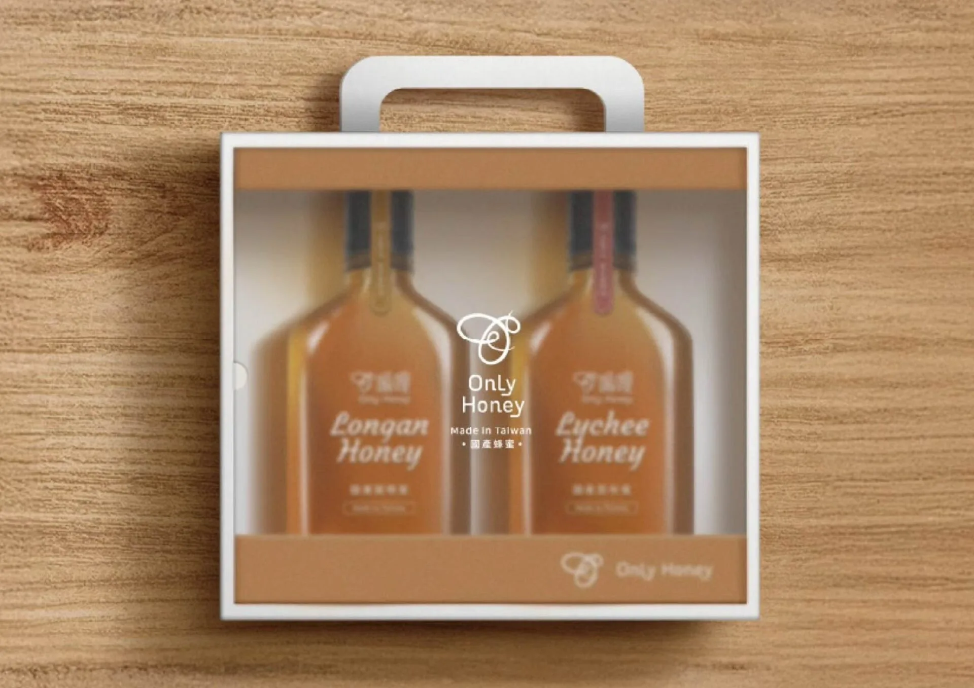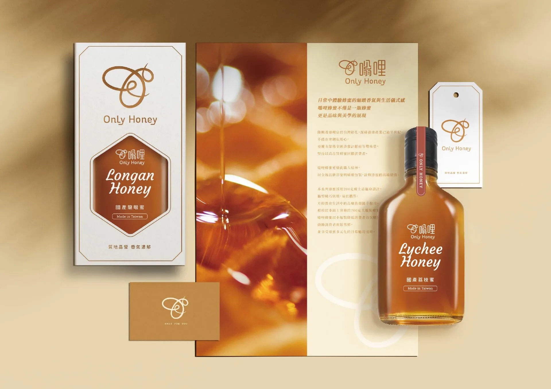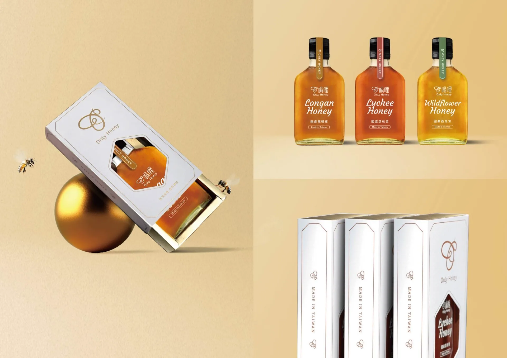 「嗡哩蜂蜜」為來隆興養蜂場所推出的高端品牌,承襲半世紀職人養蜂底蘊與多次全國評鑑頭等獎的品質口碑,透過全新品牌識別與精緻包裝,將台灣蜂蜜轉譯為都會日常中的「精品調味」。本系列以200g威士忌瓶身為核心設計:小容量降低首次購買門檻,便攜、易分享,亦便於建立「品飲式」體驗(如早餐/甜點/氣泡飲與雞尾酒調製)。視覺語彙採布爾喬亞精品風格:手寫感標誌字體與蜂蜜金色光澤營造典雅氣質;瓶頸飾帶以色彩區分品種(龍眼、荔枝、百花…)強化陳列識別;外盒以白底結合蜂巢符碼與細緻燙金,呈現純淨、精準與儀式感。通路策略聚焦早午餐店、甜點店與酒吧,建立與市場大瓶蜂蜜截然不同的「精巧、高質感、可搭配」場景,讓蜂蜜從佐料升級為生活風味提案,形塑高辨識度的精品蜂蜜品牌體驗。