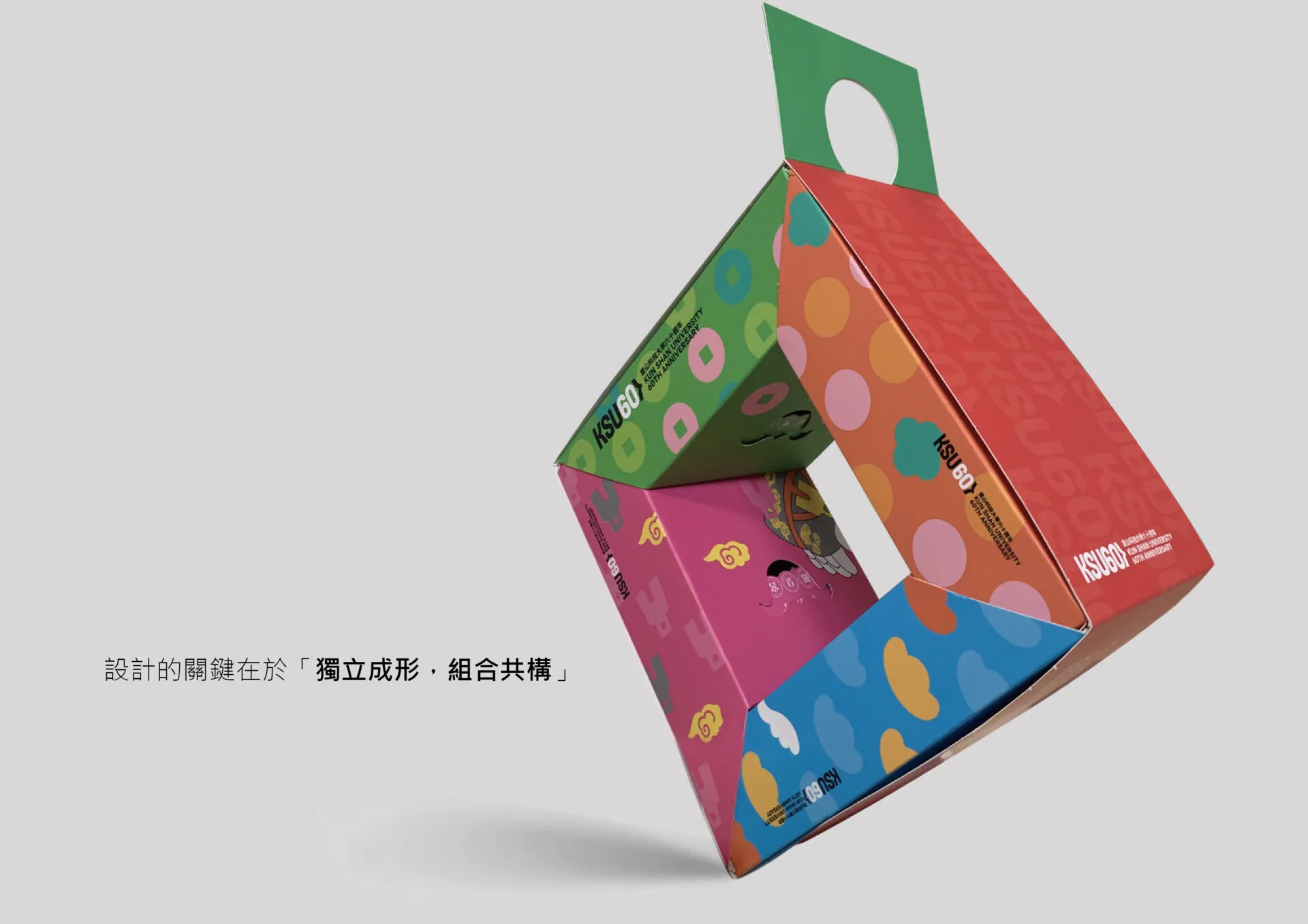 崑山科技大學60週年紀念伴手禮設計,以「環扣共生」為核心概念,回應校慶精神與永續思維。禮盒內容涵蓋四個系所,我們為每一個系所設計專屬的單一包裝與專屬IP視覺圖像,使每個單位都擁有清晰而獨立的識別性。