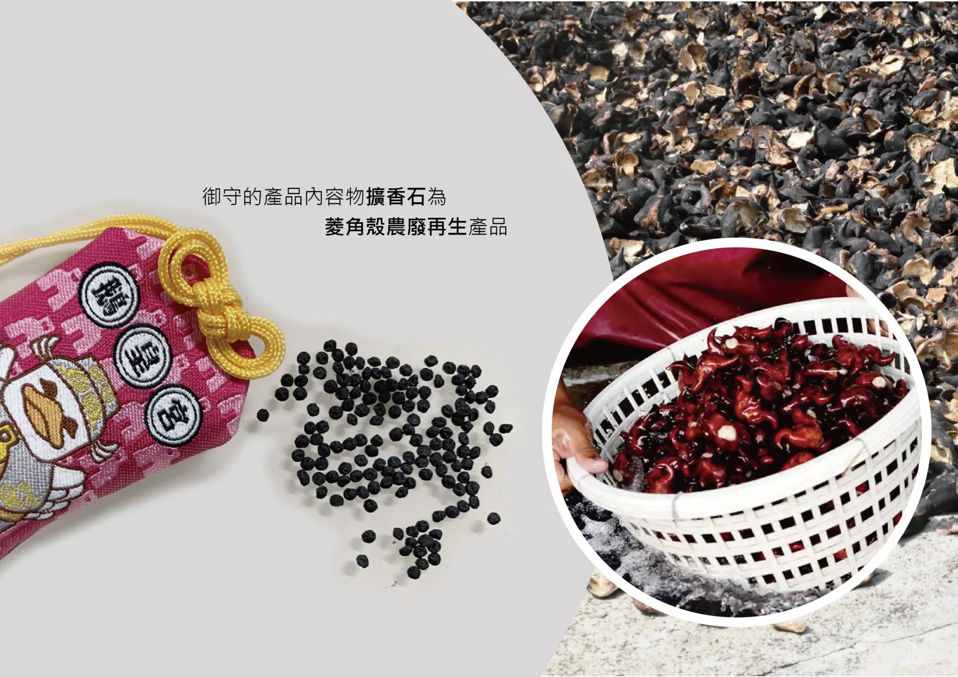 御守的產品內容物為菱角殼農廢再利用,包裝將「校慶精神、系所連結與永續理念」轉化一個象徵團結與循環的宣言。