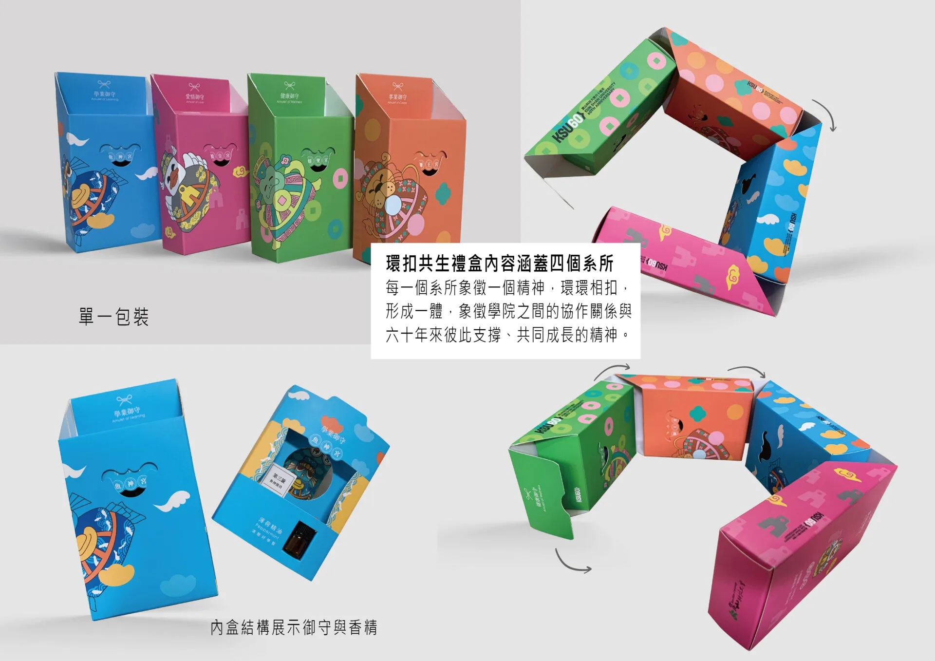 四款單盒在結構上可彼此環扣,透過模組化卡榫設計,無需額外外盒或塑膠配件,即可組裝成完整的紀念禮盒。每一個系所象徵一個圓環,當四環相扣,形成一體,象徵學院之間的協作關係與六十年來彼此支撐、共同成長的精神。