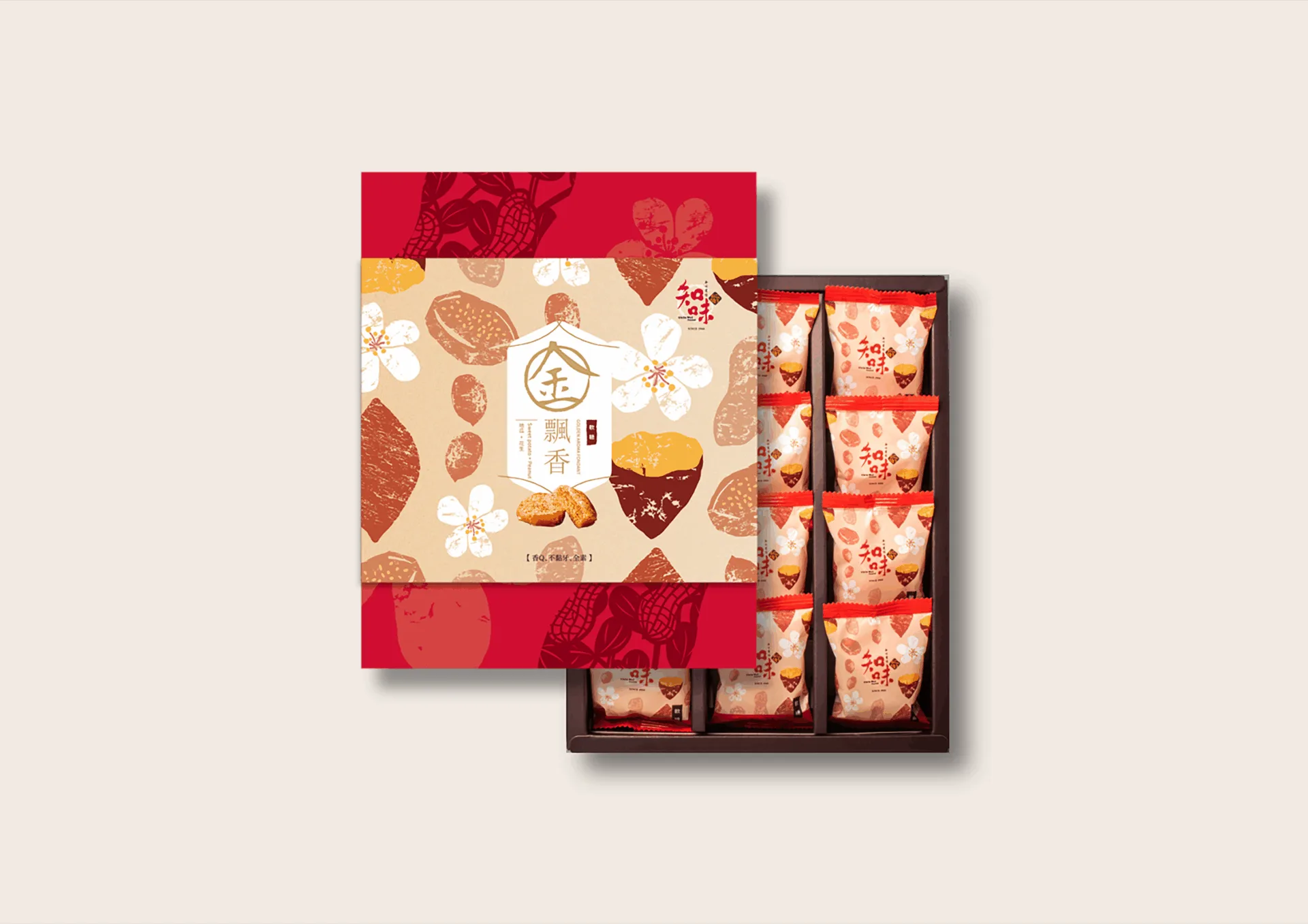 以手繪古早味文創風格為設計主軸,將地瓜、花生、客家桐花與軟糖等元素轉化為溫潤質樸的圖騰鋪陳,展現產品原料特色與在地文化意象。包裝以品牌識別圖樣與客家桐花為視覺基底,搭配暖色調層次與喜氣紅盒設計,營造濃厚的人情味與節慶氛圍,傳遞品牌「知心有味」的文化底蘊與分享美味的情感價值。
