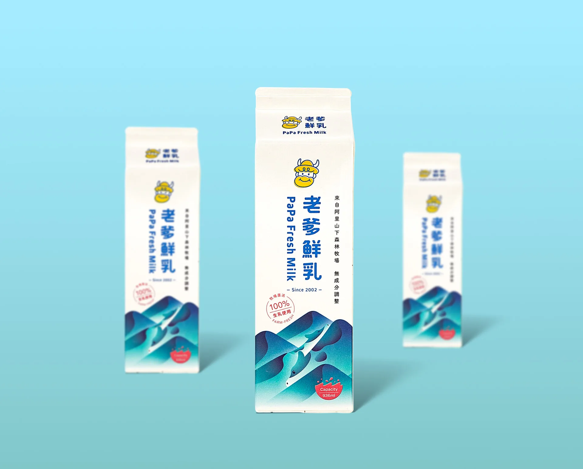 作品名稱:老爹鮮乳作品類別:大眾零售類設計:禾掌設計設計理念:透過小牛依偎在母牛身旁的溫馨畫面,傳遞對家人健康的關懷,希望每一滴鮮乳都是拉近彼此距離的橋樑,讓這份溫暖在日常點滴中持續累積,化作守護家人一輩子的健康承諾。整體視覺將動物剪影融入層疊山脈,遠觀如壯麗山景,象徵鮮乳的純粹本質與潔淨的牧場環境,營造出自然、安心的視覺感受。