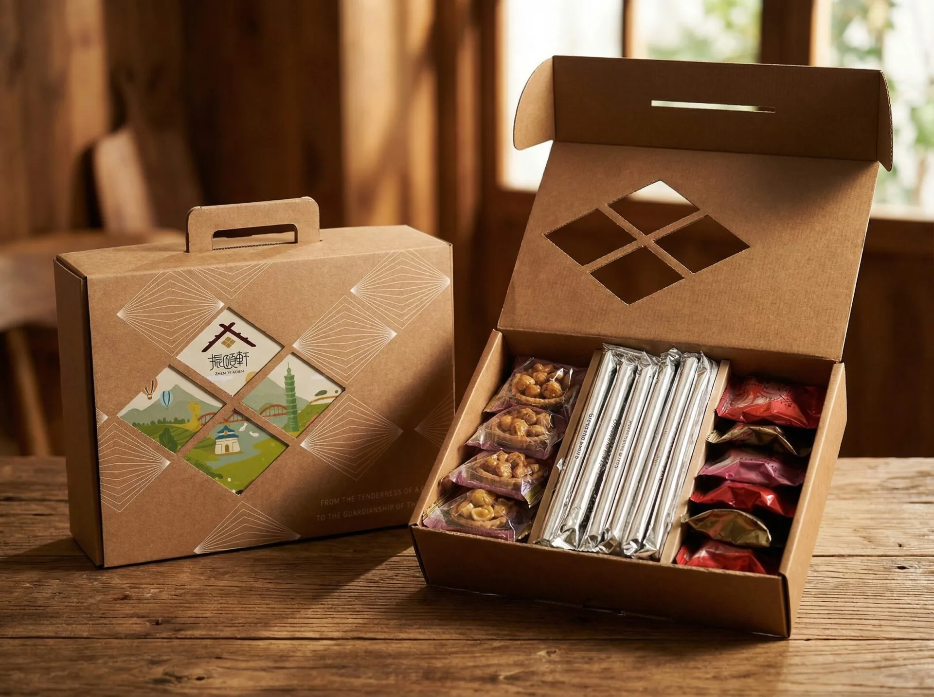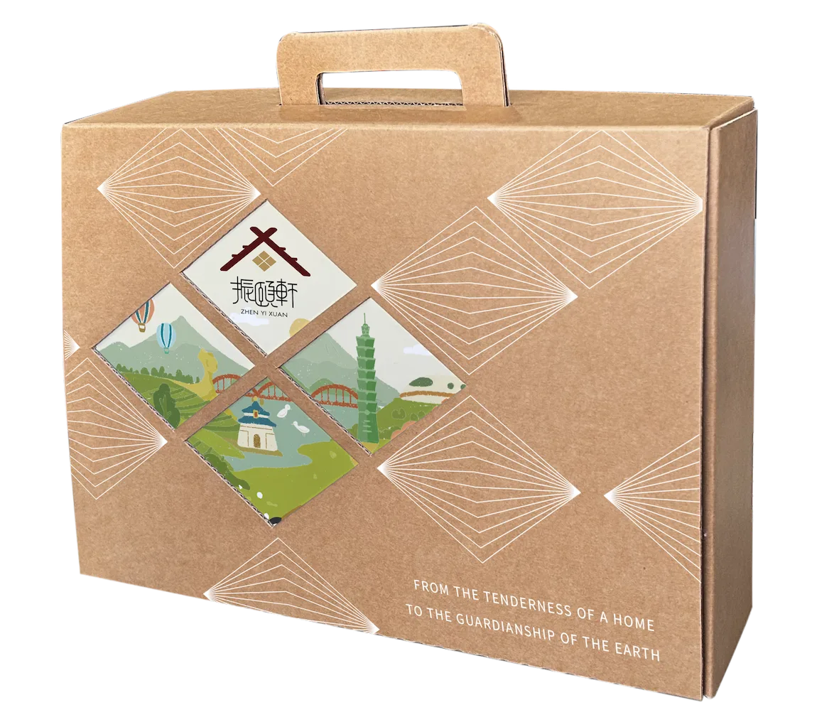 作品名稱:響紅禮盒作品類別:禮品包裝類設計:微克設計工作室 – 陳奐達設計理念:本設計將常見的飛機盒結構轉化為具提把功能的禮盒形式,使包裝同時具備運輸效率與送禮便利性。盒面以幾何開窗作為視覺焦點,透過簍空呈現內部插畫卡片與品牌標誌,形成包裝與內容物的互動關係。結構上外盒與內襯皆採無膠卡扣設計,提升組裝效率並降低材料與製程負擔;搭配單色印刷與極簡印刷面積,實踐減碳與環保理念。可收折式提把設計亦讓包裝在展示與運輸時更易於堆疊與收納。