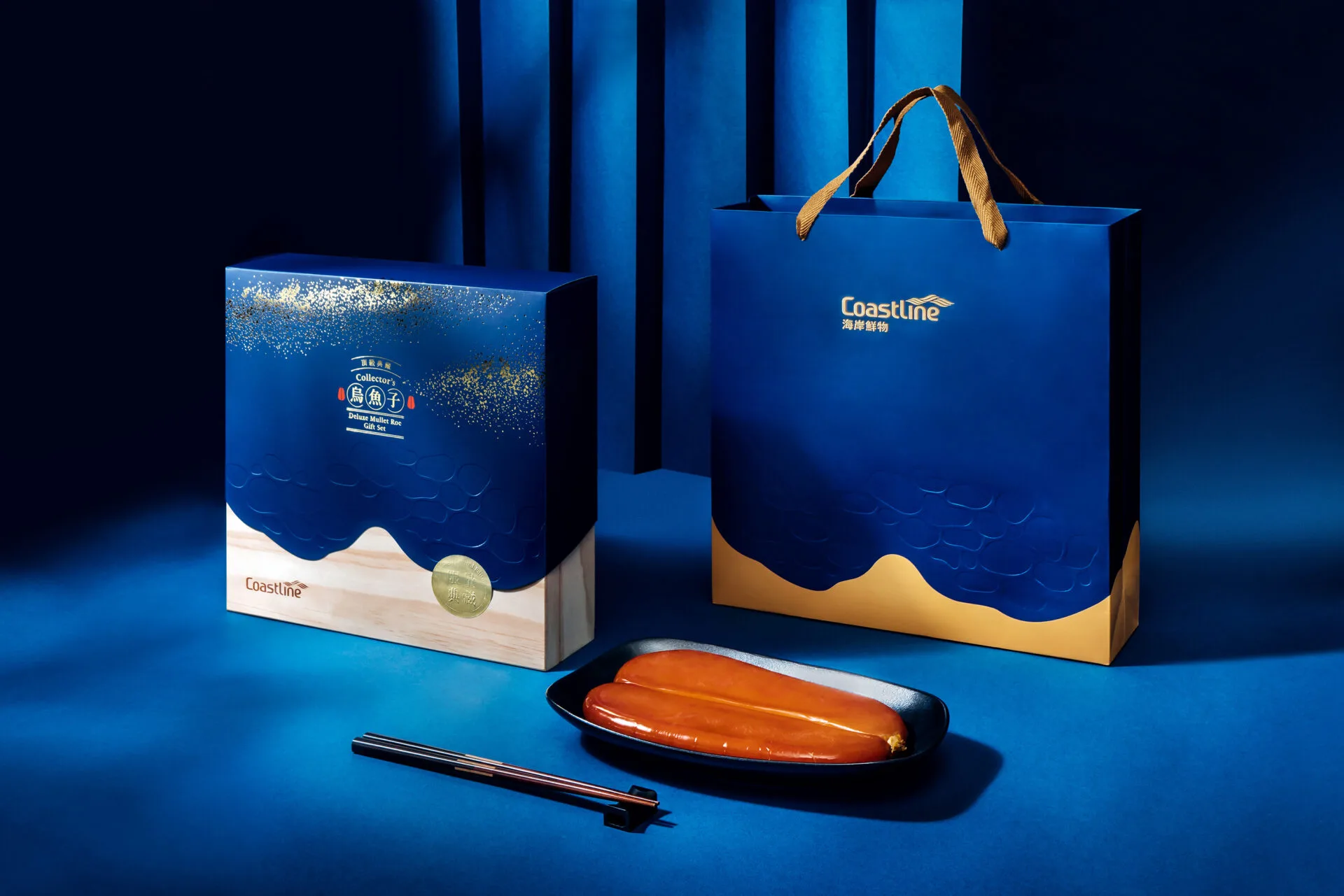 「海岸鮮物」頂級典藏禮盒精選十兩以上特級烏魚子,以木盒與高粱酒展現贈禮心意。包裝以「鮮魚上岸」為靈感,深藍袖套與木質基調交織出海洋與沙灘意象,燙金點綴如烏金閃耀,局部打凹則細膩呈現海浪層次。內裝採用黑卡與資訊燙黑,彰顯低調奢華;透明燙金貼紙讓稀有烏魚子本體完美展現。透過職人經驗與設計巧思,將一年一收的珍貴水產轉化為高雅俐落的當代精品,讓送禮者的心意與價值加倍躍然。