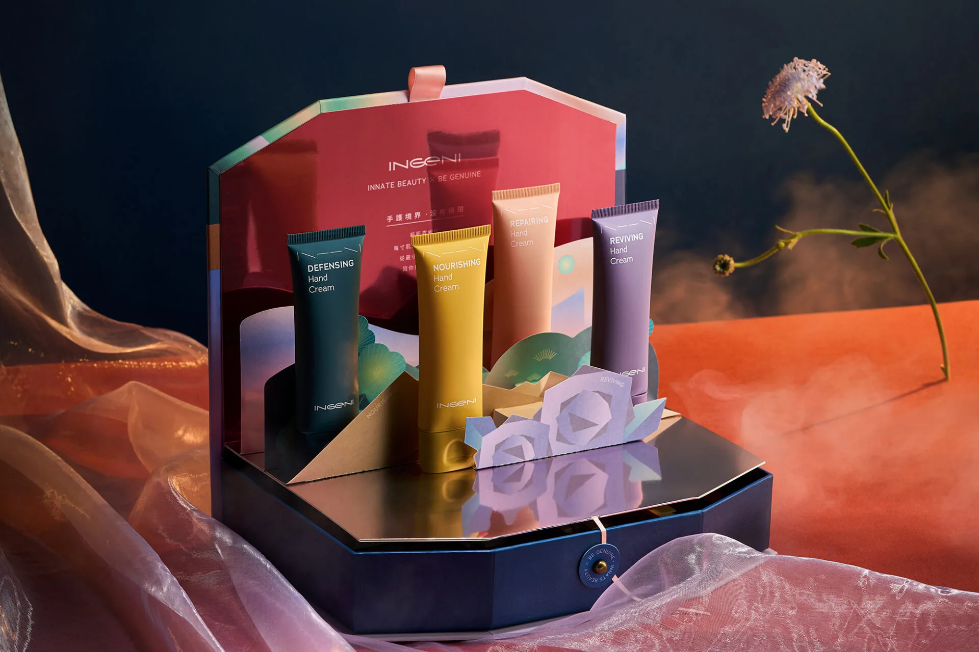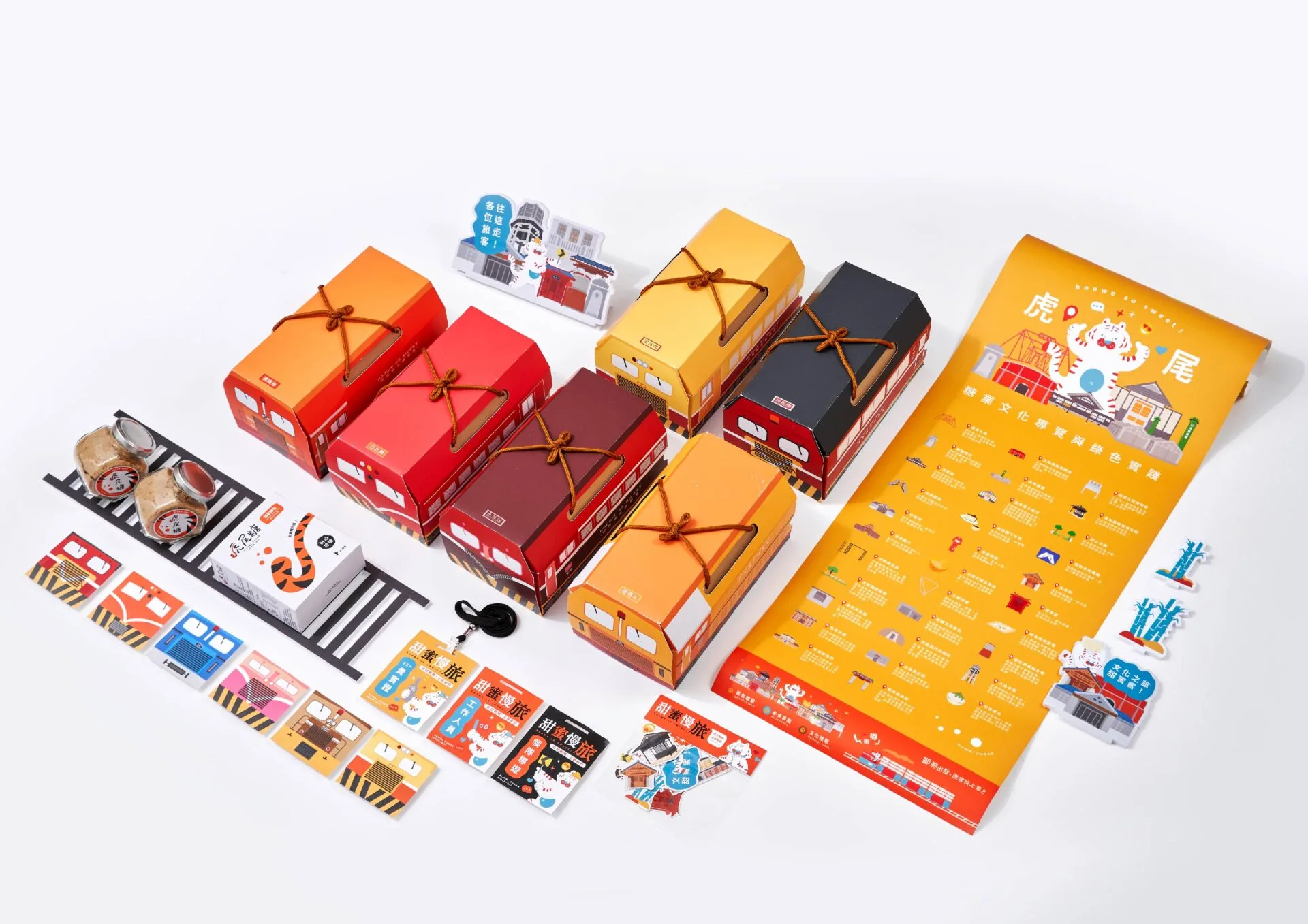 本次設計以虎尾糖廠與五分車文化為核心,從地方歷史出發,重新詮釋虎尾百年糖業的日常記憶。虎尾是台灣少數仍保有運作糖廠與五分車系統的地方,亦是雲林糖業文化的重要象徵。因此,我們以五分車造型作為禮盒主視覺,讓包裝本身成為文化載體,使消費者在開盒的瞬間就感受到虎尾的故事與地方精神。在創意與結構上,設計採單一材質、運用卡榫與可重複使用的通用盒型,並搭配各品牌共用的腰封,使六家商圈店家能在同一體系下延伸產品規格與包裝形式,達到減量、減廢與降低碳排的目的。此方式不僅創造一致的商圈辨識度,也提升包裝應用的彈性。